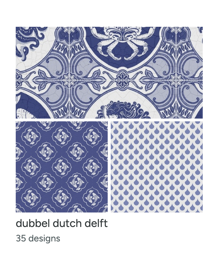 A modern spin on classic Delft tile patterns. Blue-and-white storytelling, symmetry, and repetition meet contemporary surface design—timeless, graphic, and surprisingly versatile.