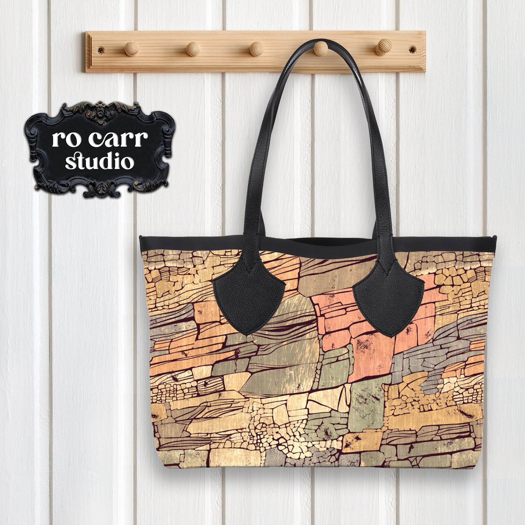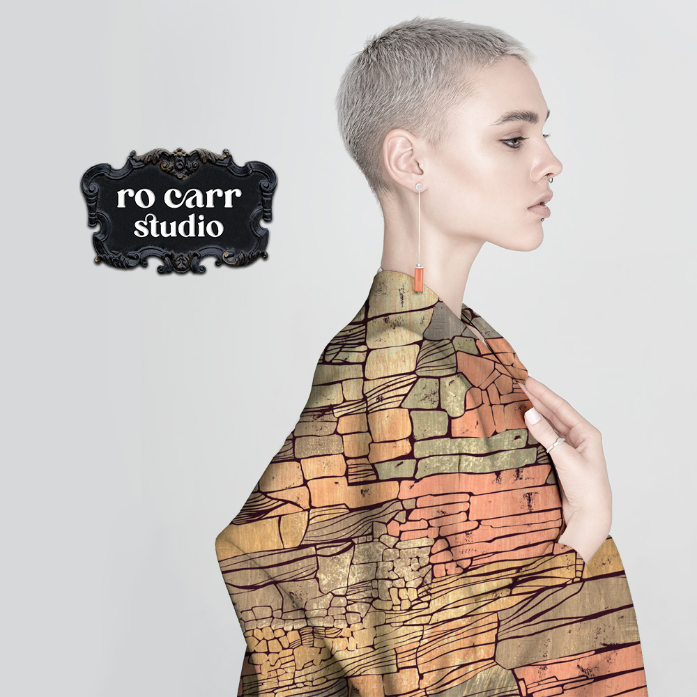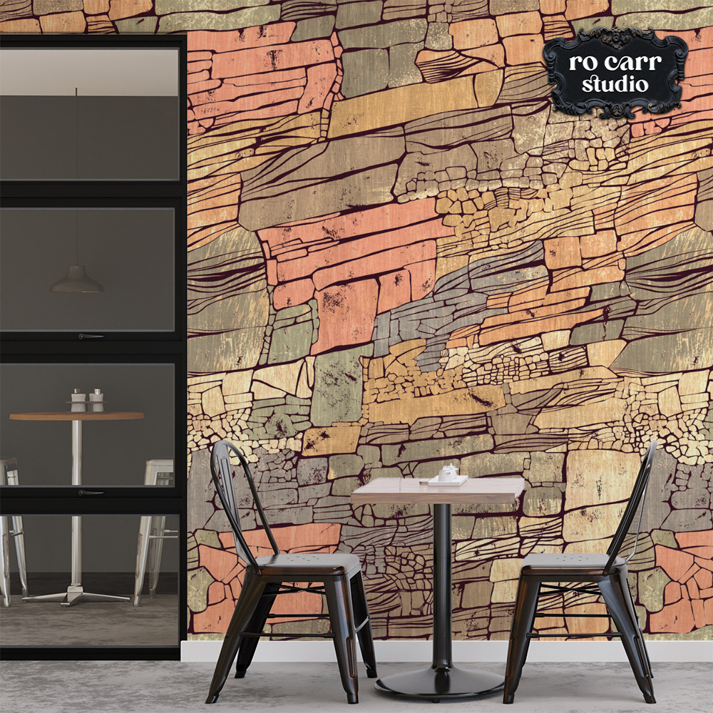 Mid century stylized rocky cliff rich in sunset tones.